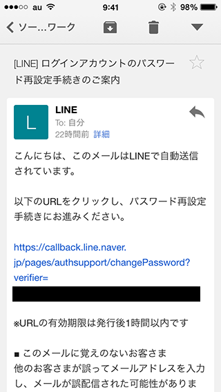 通知されるURLは「http://line.me/HelpPassword」ですが、一見LINE公式アカウントからの通知のように見せかけたフィッシングメッセージが来る可能性もあります。