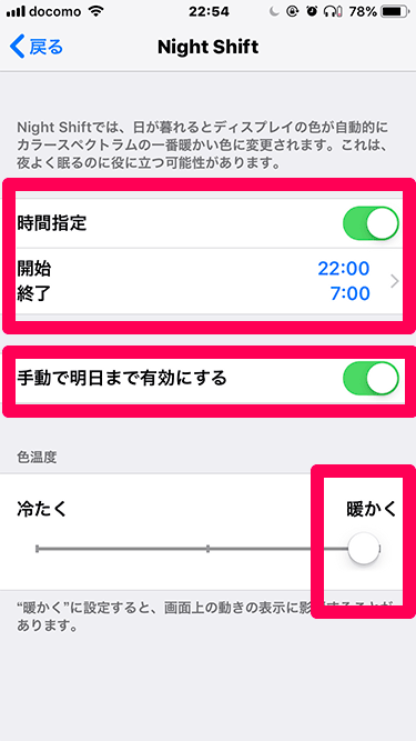 「時間指定」で画面の明るさが変わる時間帯を指定し、「色温度」を「暖かく」の一番右に設定します。