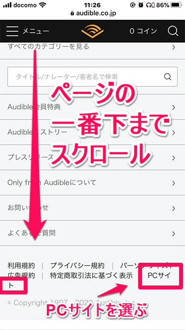 スマホを使っている場合、Audible 公式サイトの一番下にある「PCサイト」のリンクから退会用の PC サイトに移動できます。